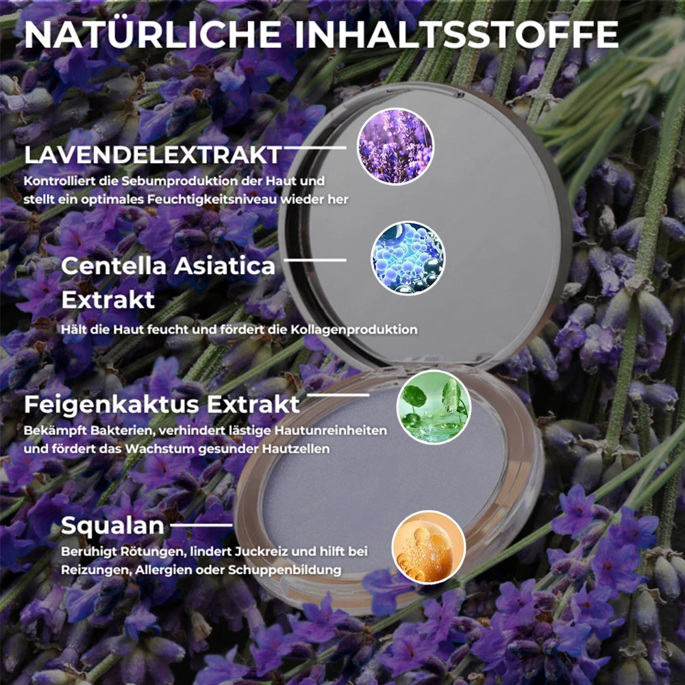 Unser Mattes Lavendel Puder ist genau dafür gemacht! Die einzigartige gelartige Formel absorbiert überschüssiges Öl und sorgt für ein langanhaltendes, mattes Finish. Keine glänzende Haut mehr – dein Teint bleibt stundenlang frisch, ohne dass du ständig nachbessern musst.